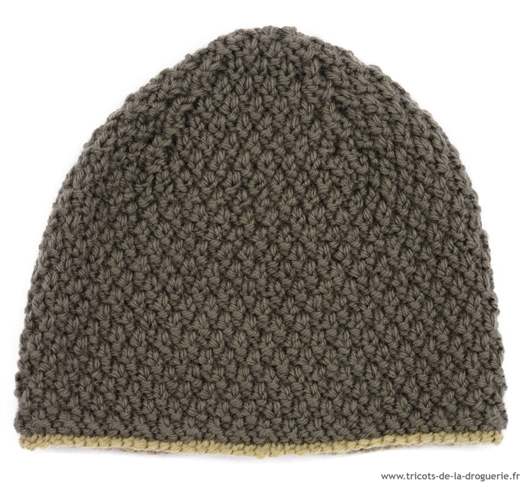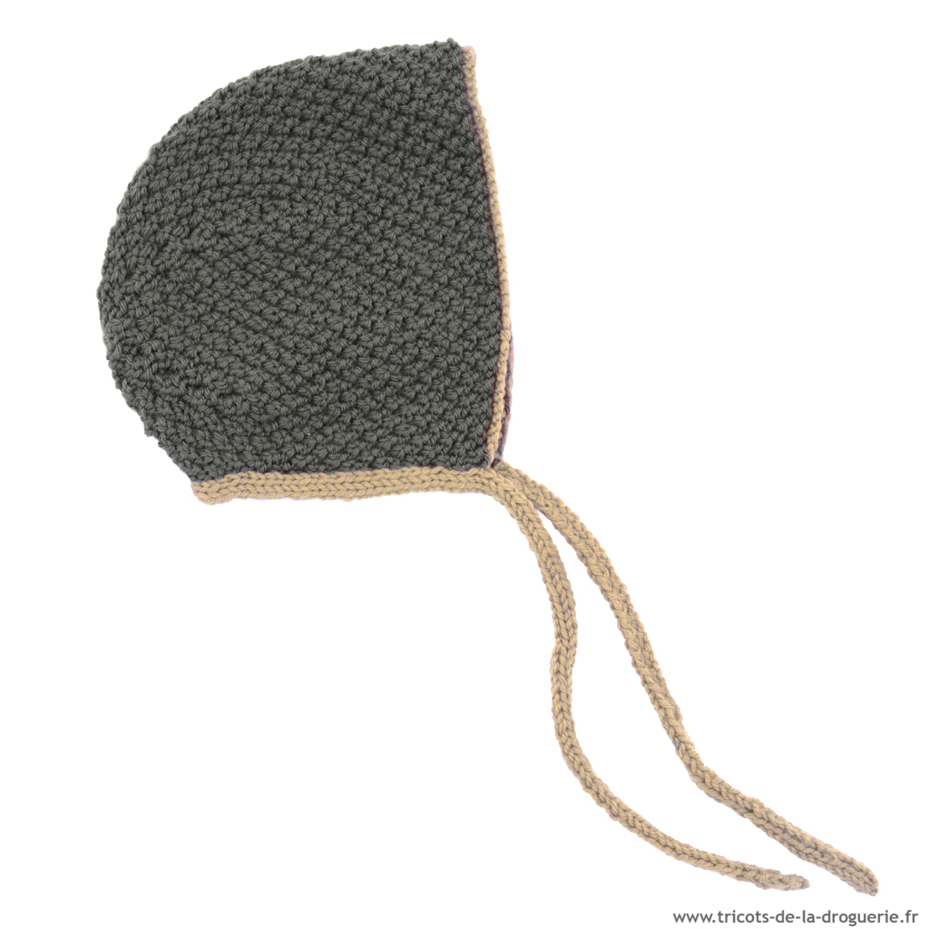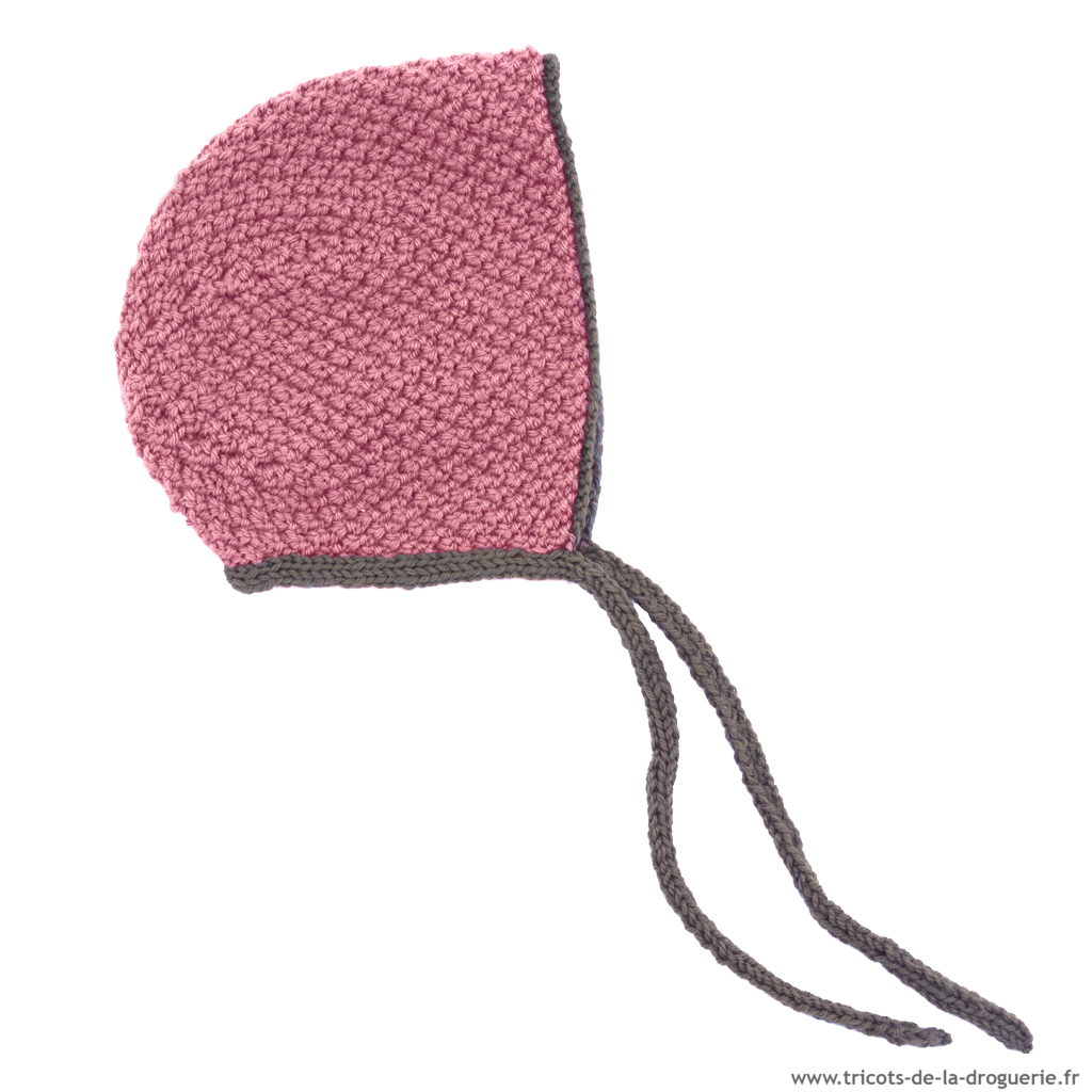 Le béguin se tricote en « Surnaturelle », au point de blé, aiguilles 4.
