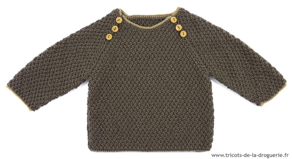 On ouvre les raglans du pull grâce aux petits boutons en bois.