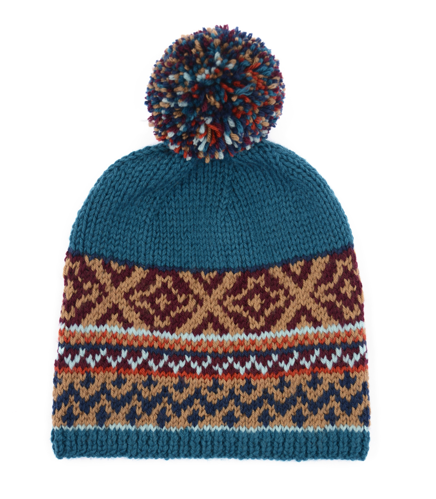 La partie unie du bonnet est tricotée avec la Surnaturelle en double coloris pétrole et les aiguilles 5.5. La partie en jacquard est tricotée