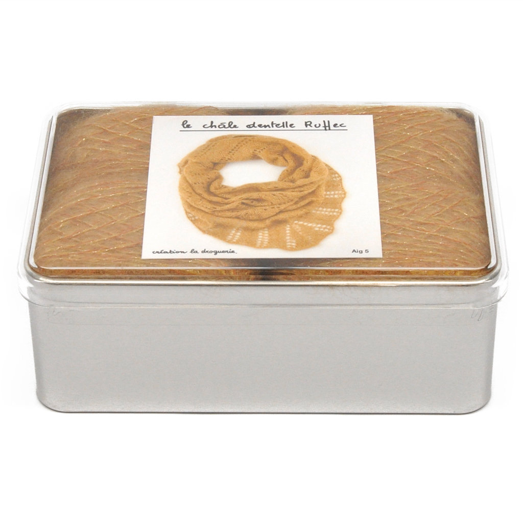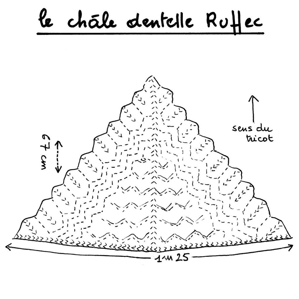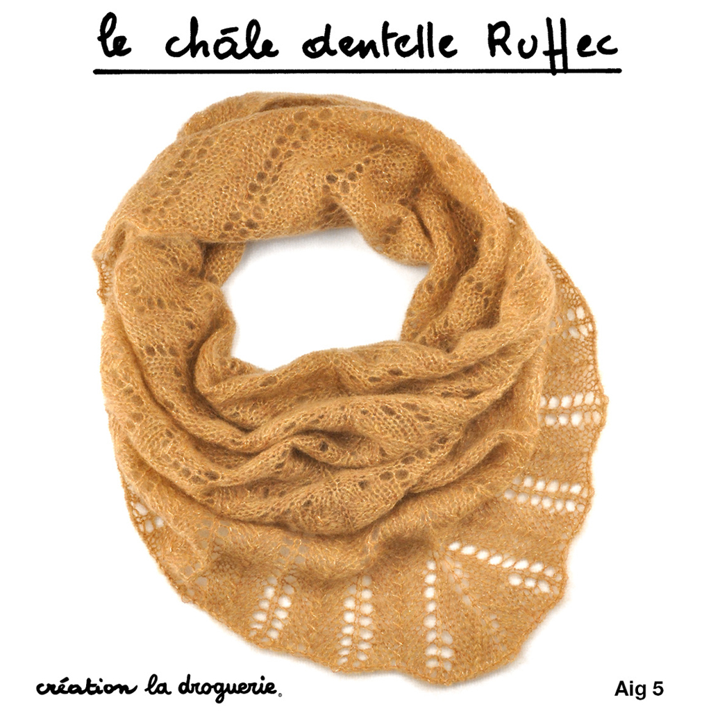 Le châle se tricote en Comète : 60% mohair, 5% fil métallisé, 26% polyamide, 9% cupro. Ce châle est extrait du livre « En Famille » à La Droguerie.