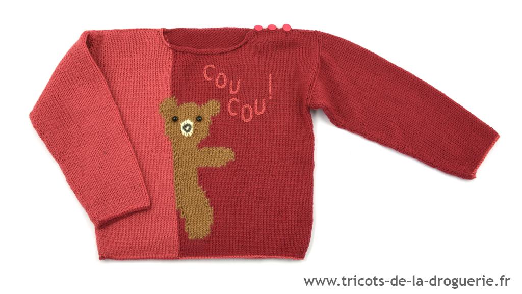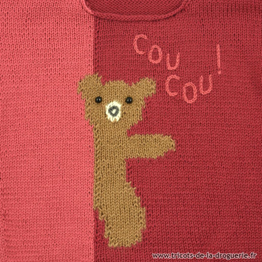 derrière un rideau et qui nous fait « coucou » ! Tricoté en Surnaturelle et en Alpaga (pour l’ours),