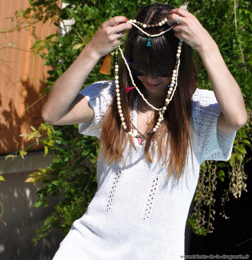Le sautoir d’été : des perles en bois, des pompons, un petit nœud et on l’enfile sur toutes nos robes légères !