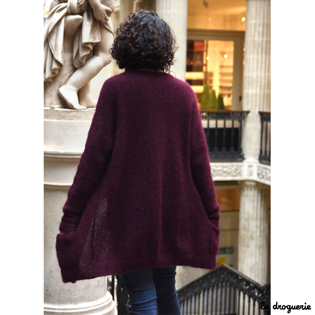 Longue veste tricotée en jersey endroit. Emmanchures légèrement chauve-souris, manches très longues, traitées en rang raccourcis pour épouser