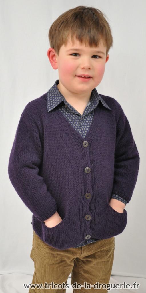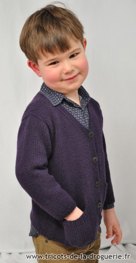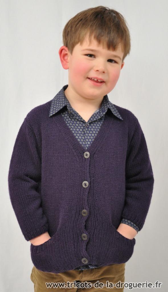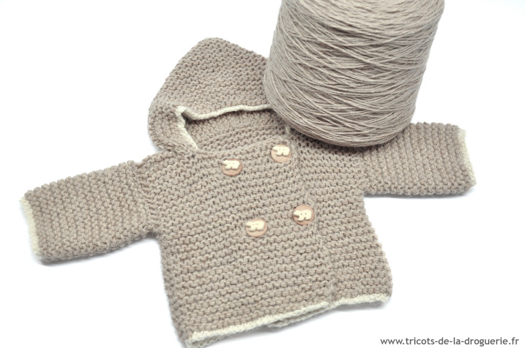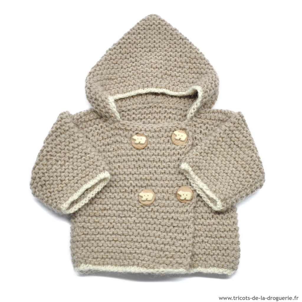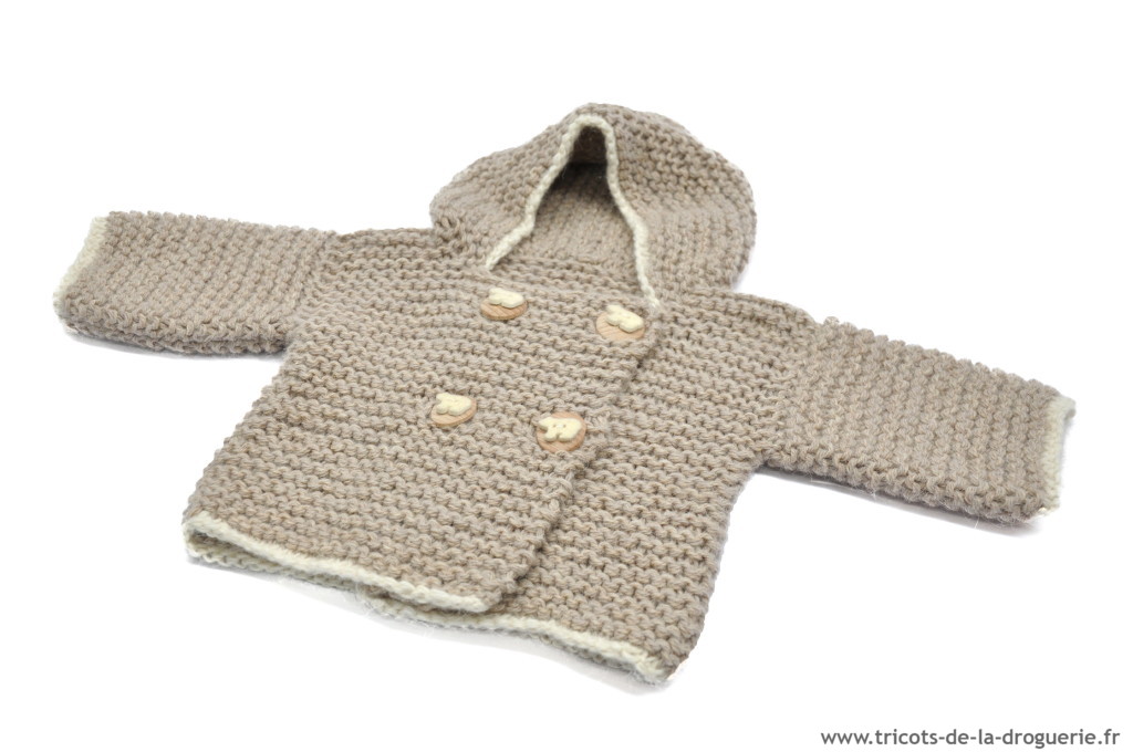 Le paletot à capuche « Groenland » Tailles naissance – 3 – 6 – 12 mois Tricoté au point mousse. Aig 7