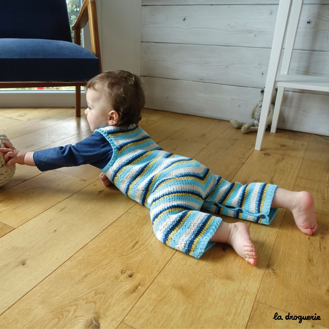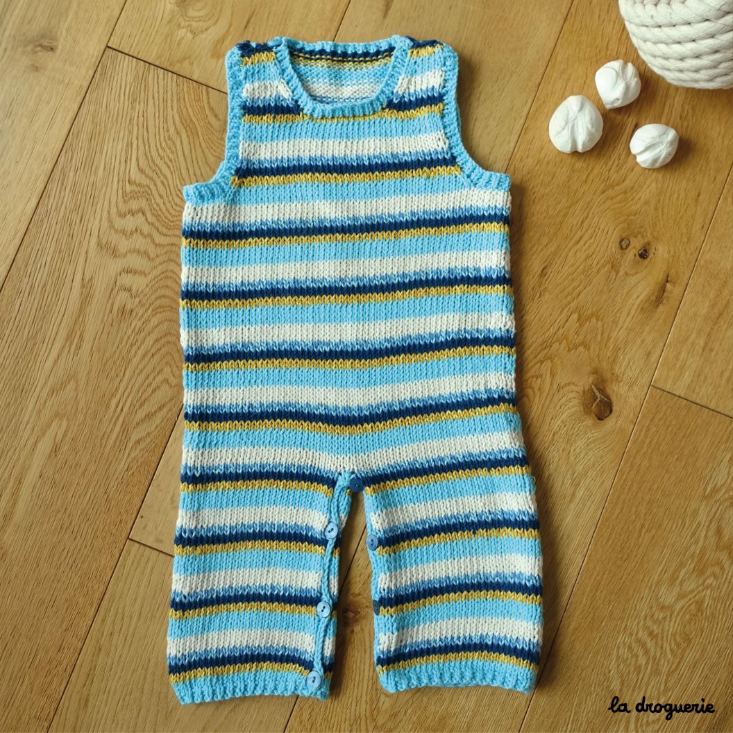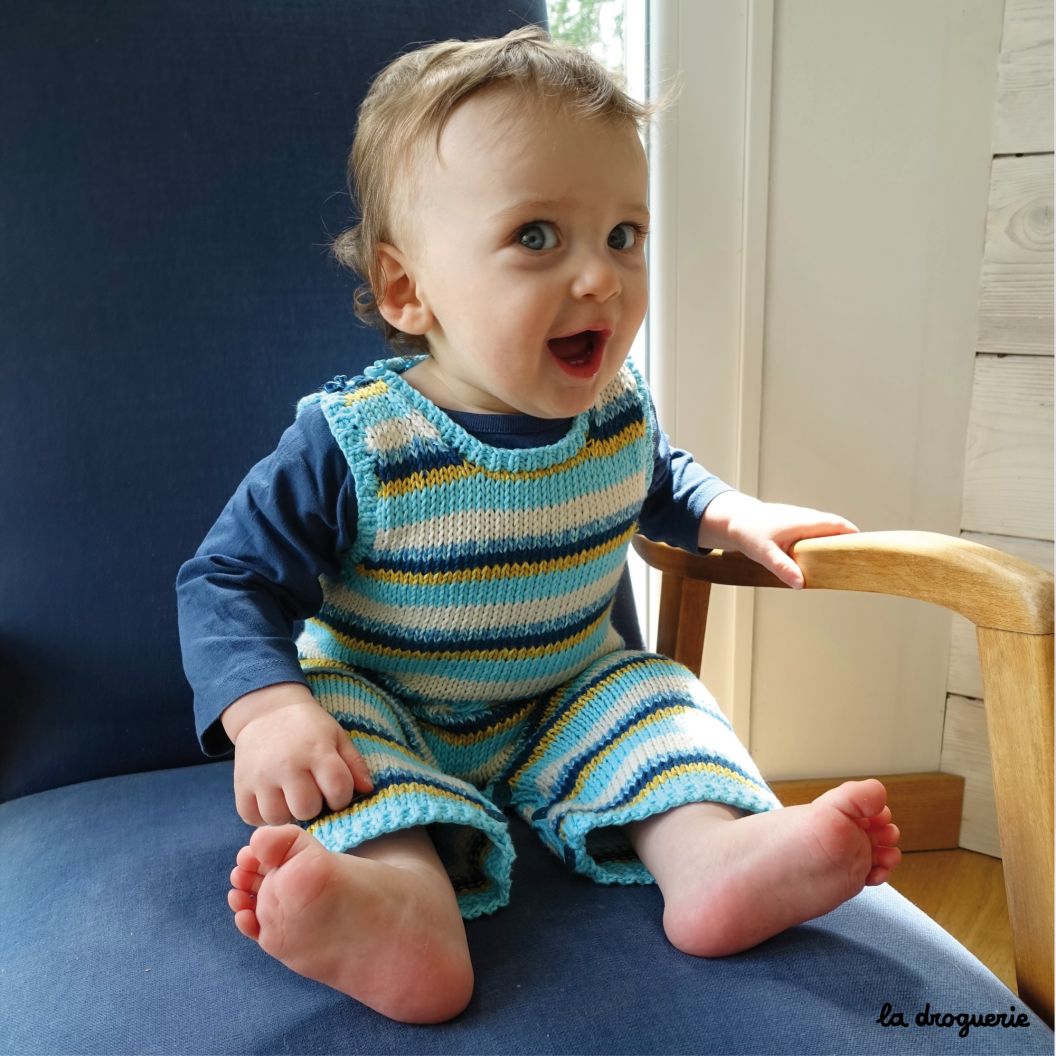 Combinaison pour bébé sans manches tricotée en jersey endroit rayé. Encolure ronde, emmanchures et bas de jambe bordés de côtes 1/1. Un joli jeu de rayures réalisé en Fleur de coton (100% pur coton bio) et Salade de fruits (50% coton bio et 50% bambou).