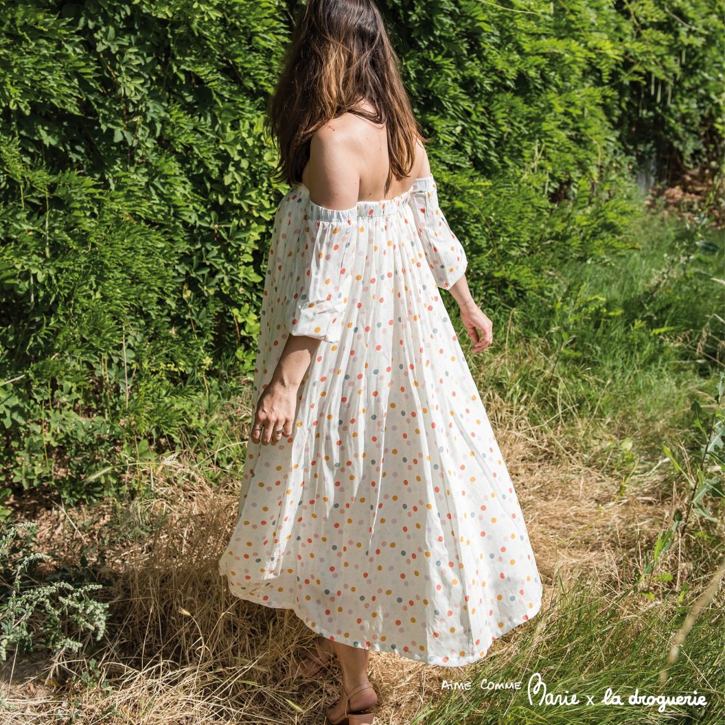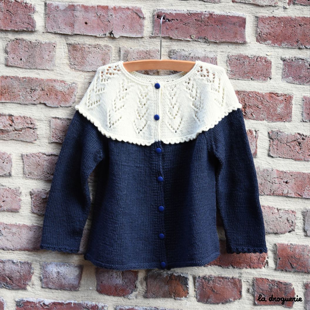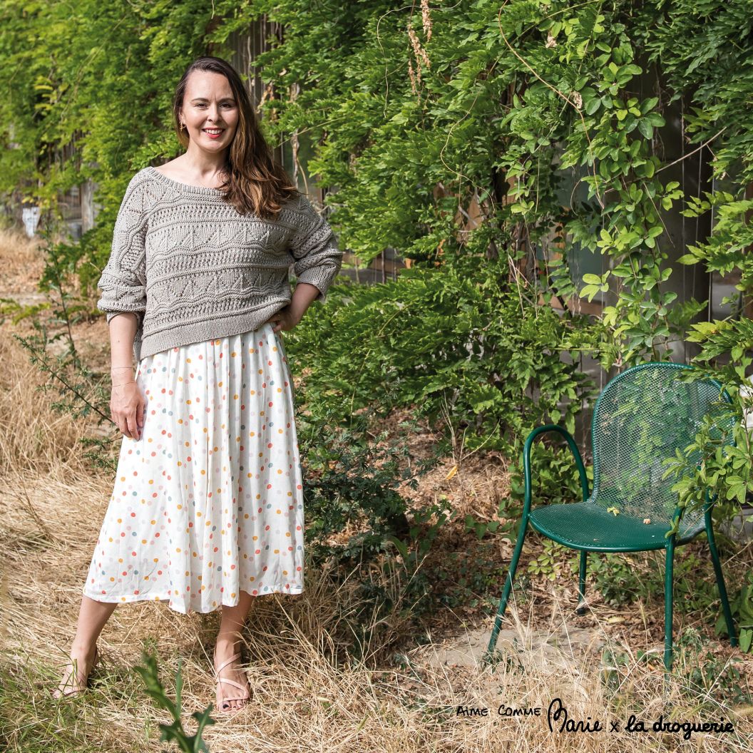 Voici le look « Auteuil » On commence avec notre joli pull « Moroni » en Fleur coton bio ou en Pépites, au point dentelle et sa construction asymétrique qui donne son épaule dénudée.