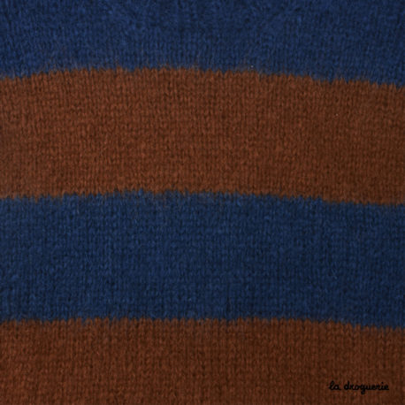 Il est tricoté en Kid Mohair (90% toison de jeune chèvre angora et 10% polyamide pour la solidité). Modèle loose en jersey endroit. Emmanchures basses. Larges rayures. Col, poignets et bas du pull en côtes 2/2.