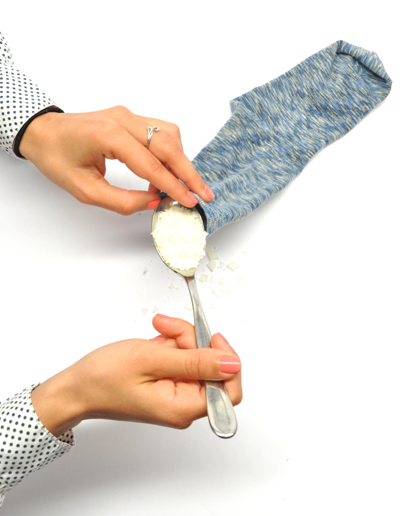 Je verse ma cuillerée à soupe de savon de Marseille en paillettes dans ma chaussette.