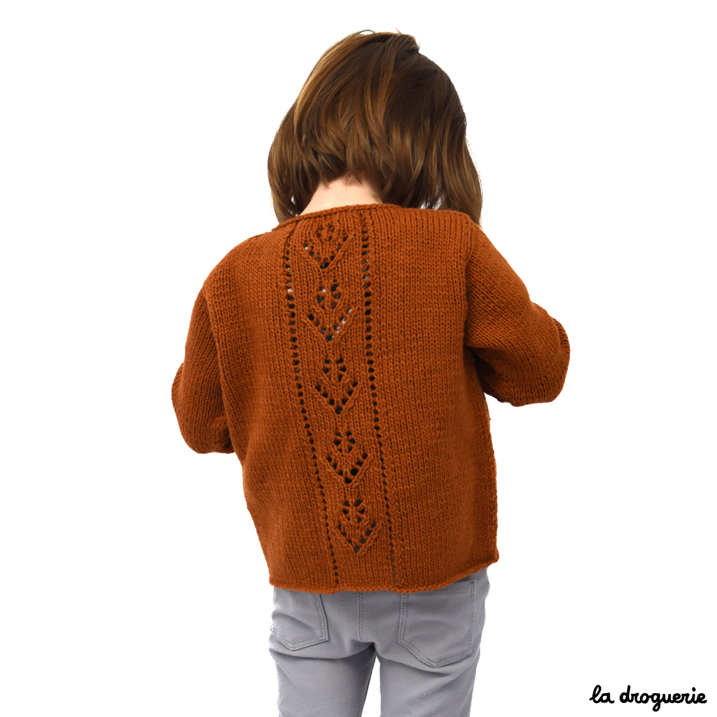 Tricoté en mini.B en fausse côte anglaise à emmanchures basses pour donner de l’ampleur, accentuées par le jeu de côtes 1/1.