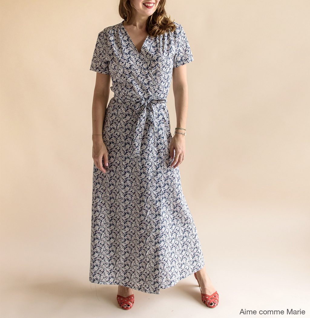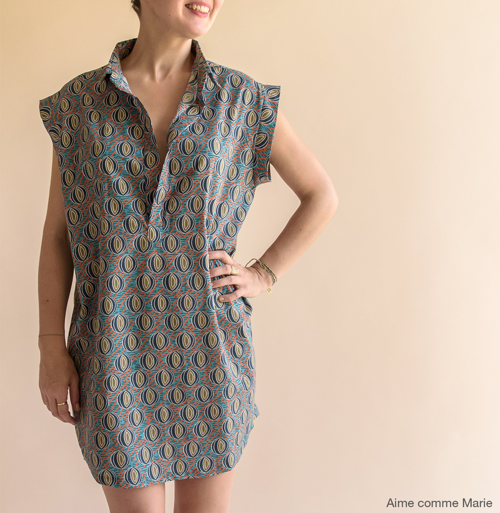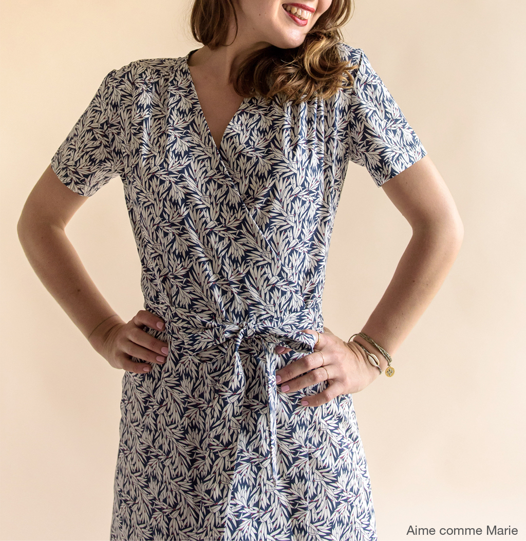 par une ceinture élastique. On le ferme avec un gros noeud à la taille. Les 3 tissus proposés sont en Rayonne, ils sont légers et fluides.