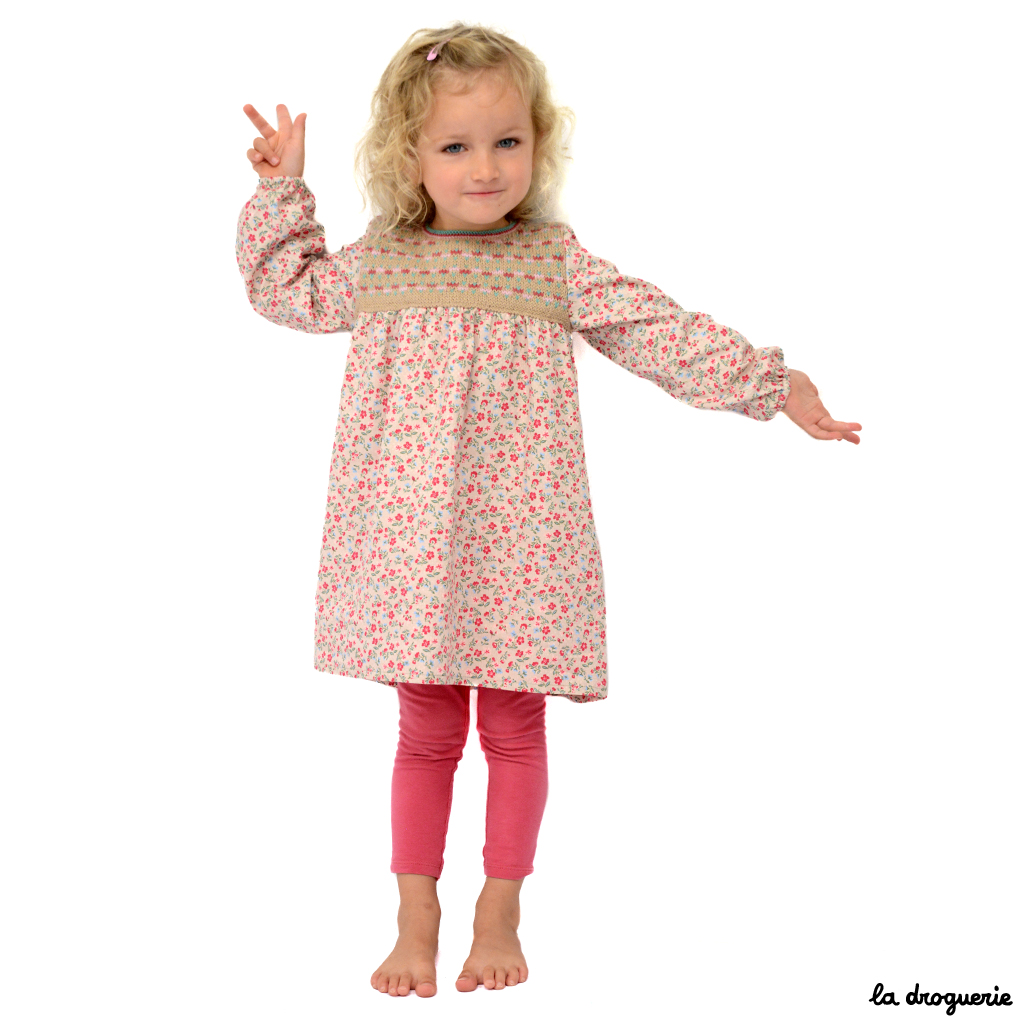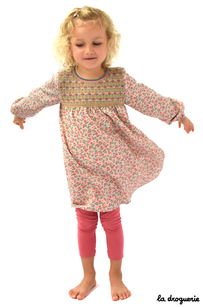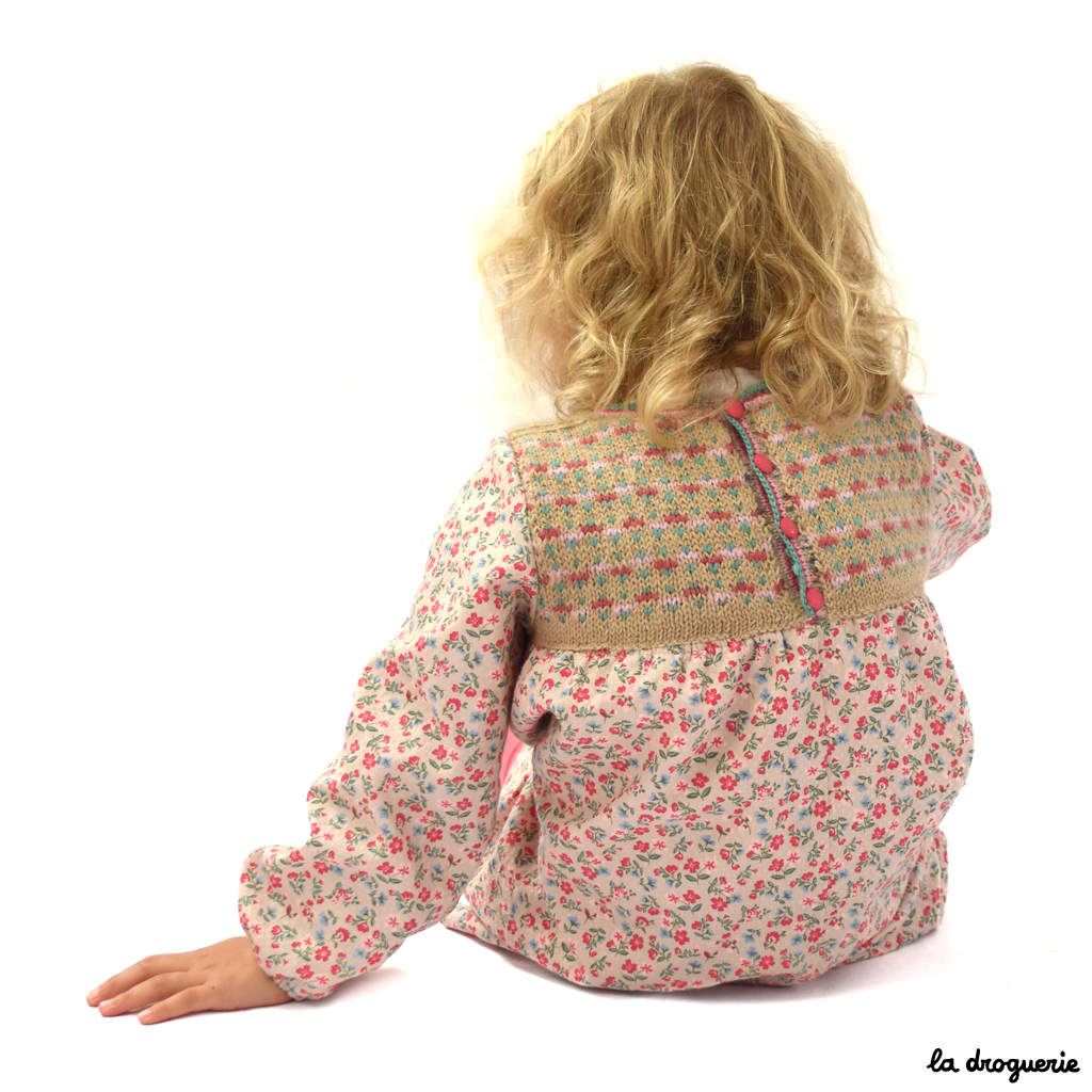 La robe « Square des Batignolles » Du 2 au 8 ans. Aig. 3 et 4. Robe avec un empiècement devant et dos, tricoté en Jersey et en Jacquard à fils tissés, en Alpaga et en Surnaturelle.