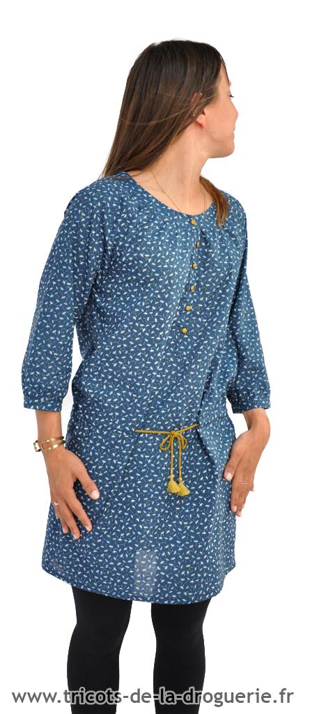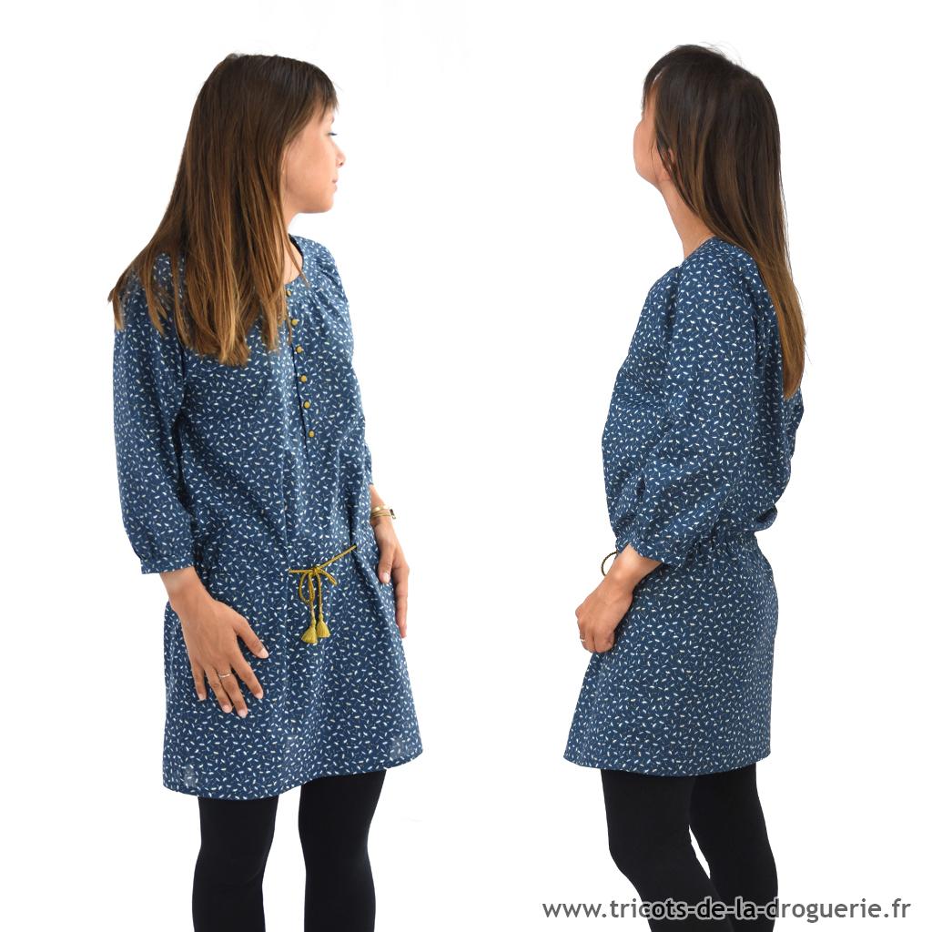 Robe resserrée à la taille par un lien agrémenté de pompons aux extrémités.