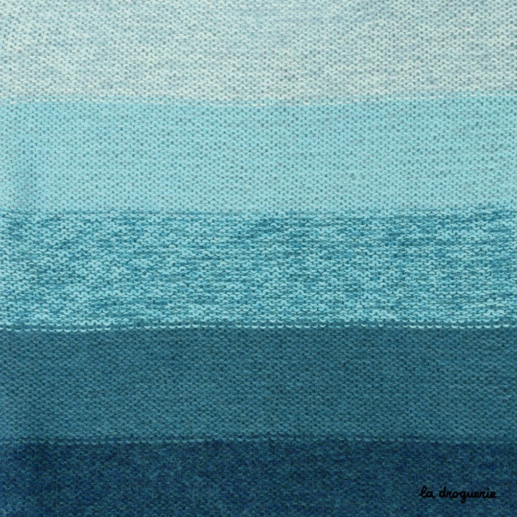 Tricotés en mélange Alpaga + Plumette, avec des aiguilles 4.5 et 3.5. Jersey envers avec un joli jeu de couleurs dégradées. Le cardigan et l’épaule du pull sont fermés par des boutons en coquillage Akoya.