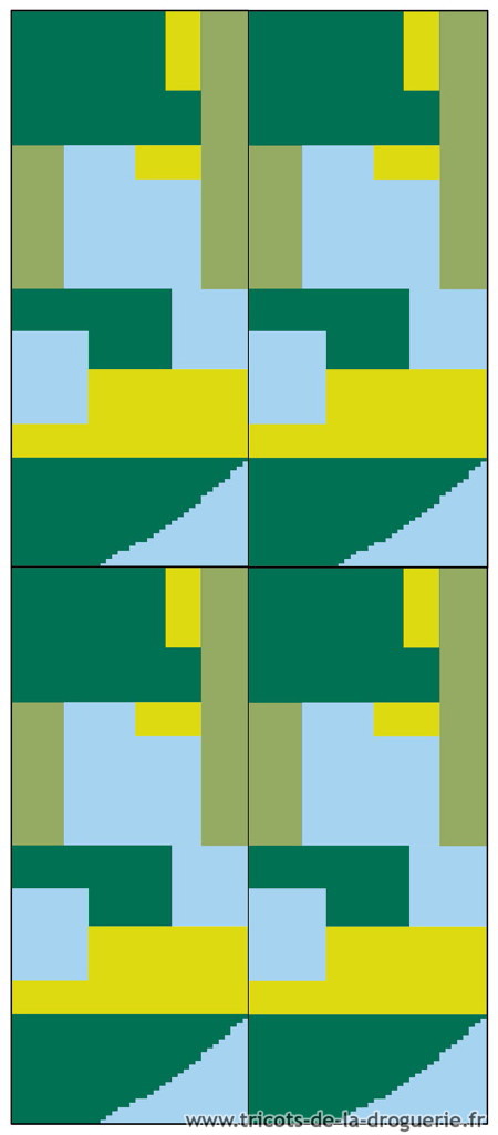 On tricote le motif 2 fois dans la largeur et 2 fois dans la hauteur.