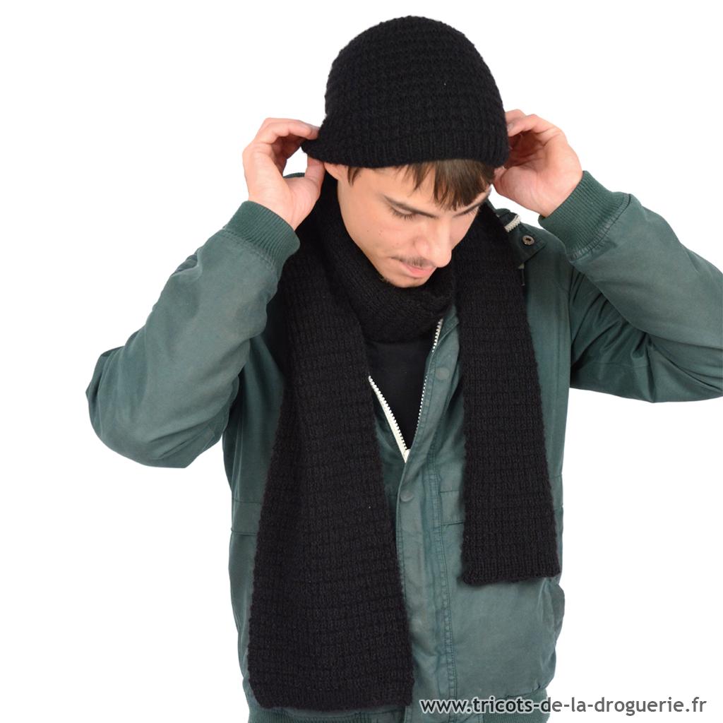 Le bonnet assorti est tricoté à plat avec une couture à l’arrière.
