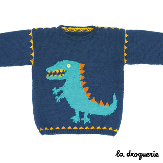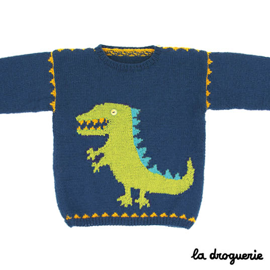 Le dinosaure est tricoté en jacquard à pelotes séparées et fils tissés.