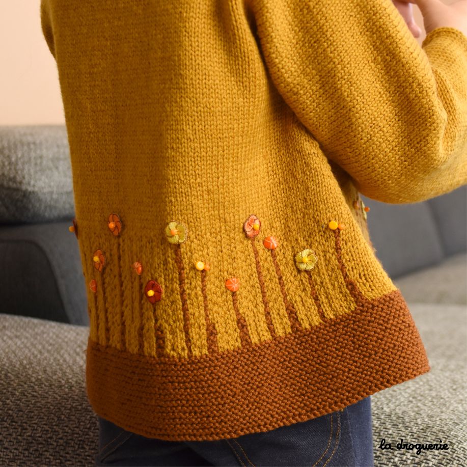 Les manches sont raglans, les bordures en côtes 1/1 soulignées d’une couleur contrastée. Fermeture par une bande de côtes 1/1 avec 7 boutonnières et de jolis boutons en corozo.