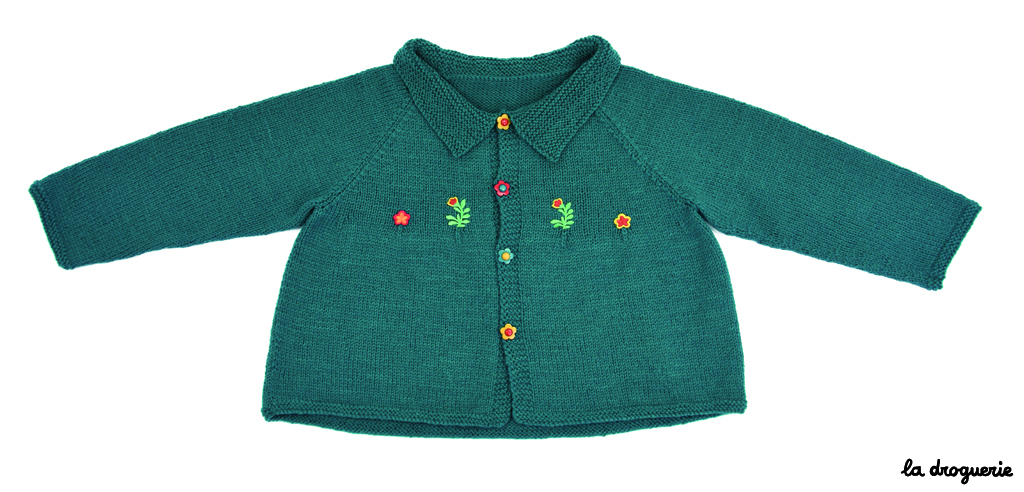 Veste à manches raglans et petit col,tricotée en Surnaturelle col. « Pétrole » en jersey endroit avec les bordures et le col au point mousse.