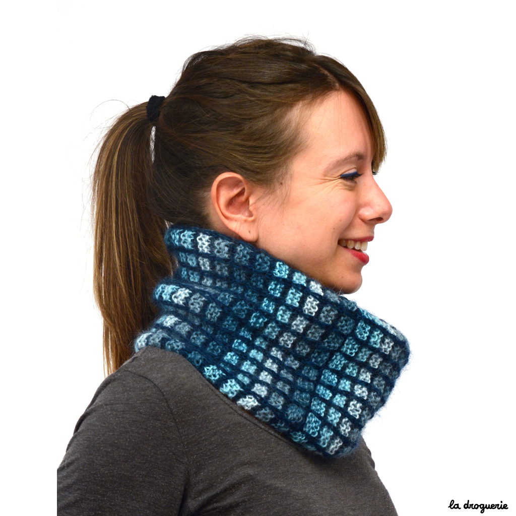 Col tricoté en point fantaisie à mailles glissées dans un camaïeu de bleus.