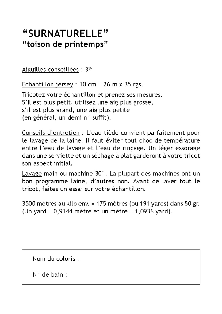 Il se tricote en Surnaturelle (100% pure laine peignée).