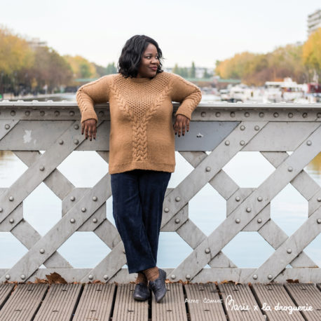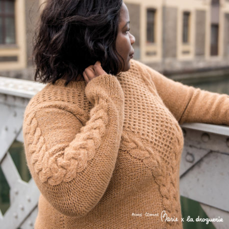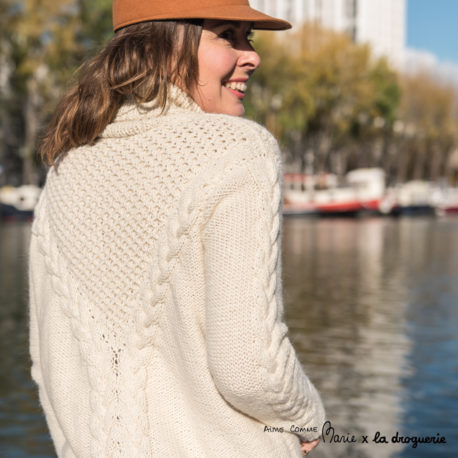 Pull à torsades tricoté en Doux-Rêve (16% Angora, 36% Laine et 48% Alpaga), en Côtes 1/1 pour les poignets, le bas du pull et le col roulé,