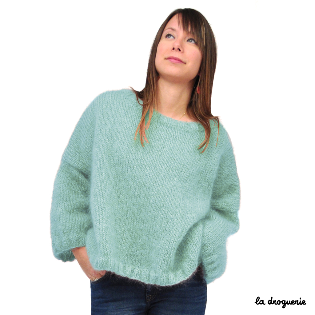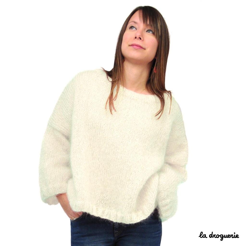 Le pull est droit, large à emmanchures basses.