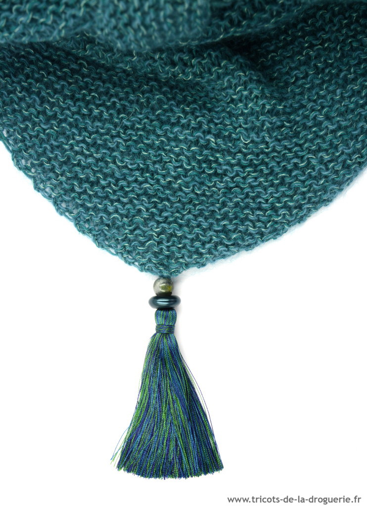 le châle à pompons Rue du Bac – 50 cm de hauteur env. – Caresse – Aig 5. Vous pouvez commander ce châle sur www.e-droguerie.com dans la rubrique IT TRICOT.