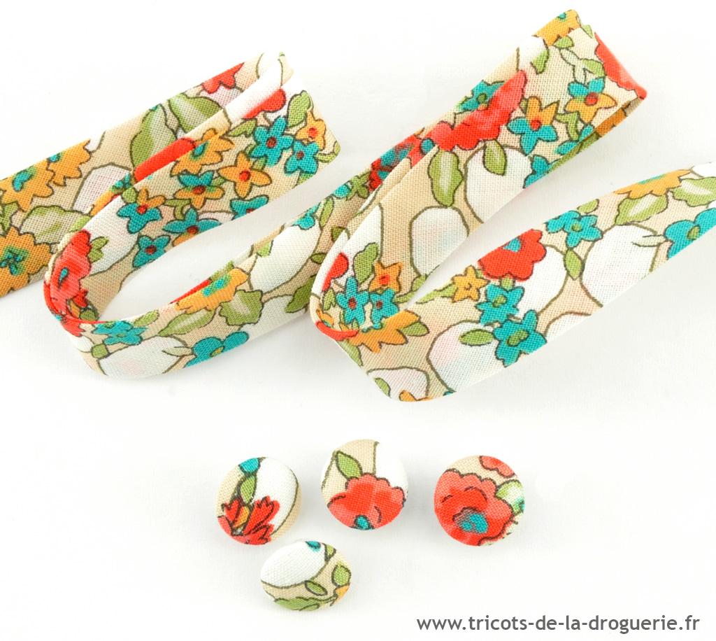 Tissu, biais et boutons assortis.