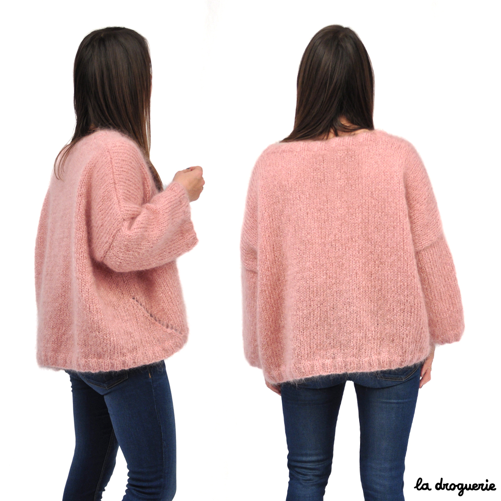 Il est tricoté en Kid Mohair (90% toison de jeune chèvre angora et 10% polyamide pour la solidité). Modèle généreux en jersey avec les bordures en côtes 2/2 qui resserrent. Large torsade centrale Devant et Dos.