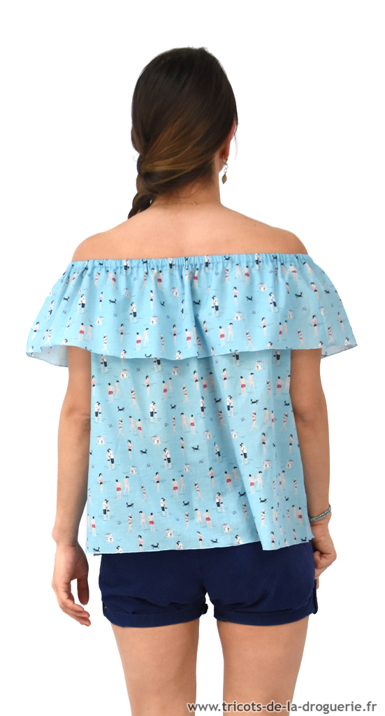 Top à encolure Bardot. Il est froncé aux épaules par un élastique.